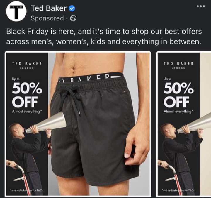 Ted Baker didn’t have a particularly standout offering this year, but they gained a lot of attention on social media for their unfortunate choice of graphic overlay for their Facebook Catalogue ads.