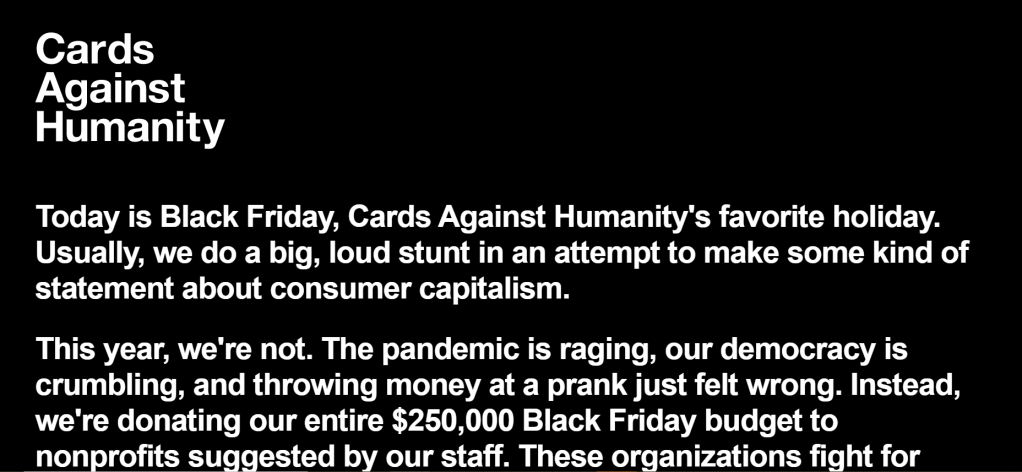 The first brand that I tend to look to is Cards Against Humanity, not because I am a customer or even a fan, but because they always seem to pull a PR stunt for Black Friday. You may have heard of their past campaign, leaving a payment form on their website for visitors to pay them £5 – why? No reason!