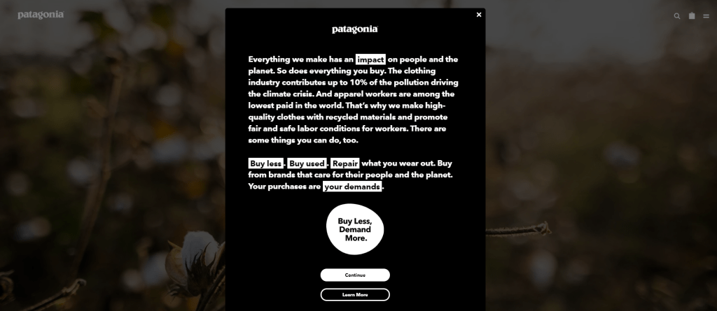 “Buy Less, Demand More” is an initiative pushing for a circular economy. This campaign integrates the company’s four-year-old ‘Worn Wear’ program which encourages recycling and repurposing used clothing and gear.